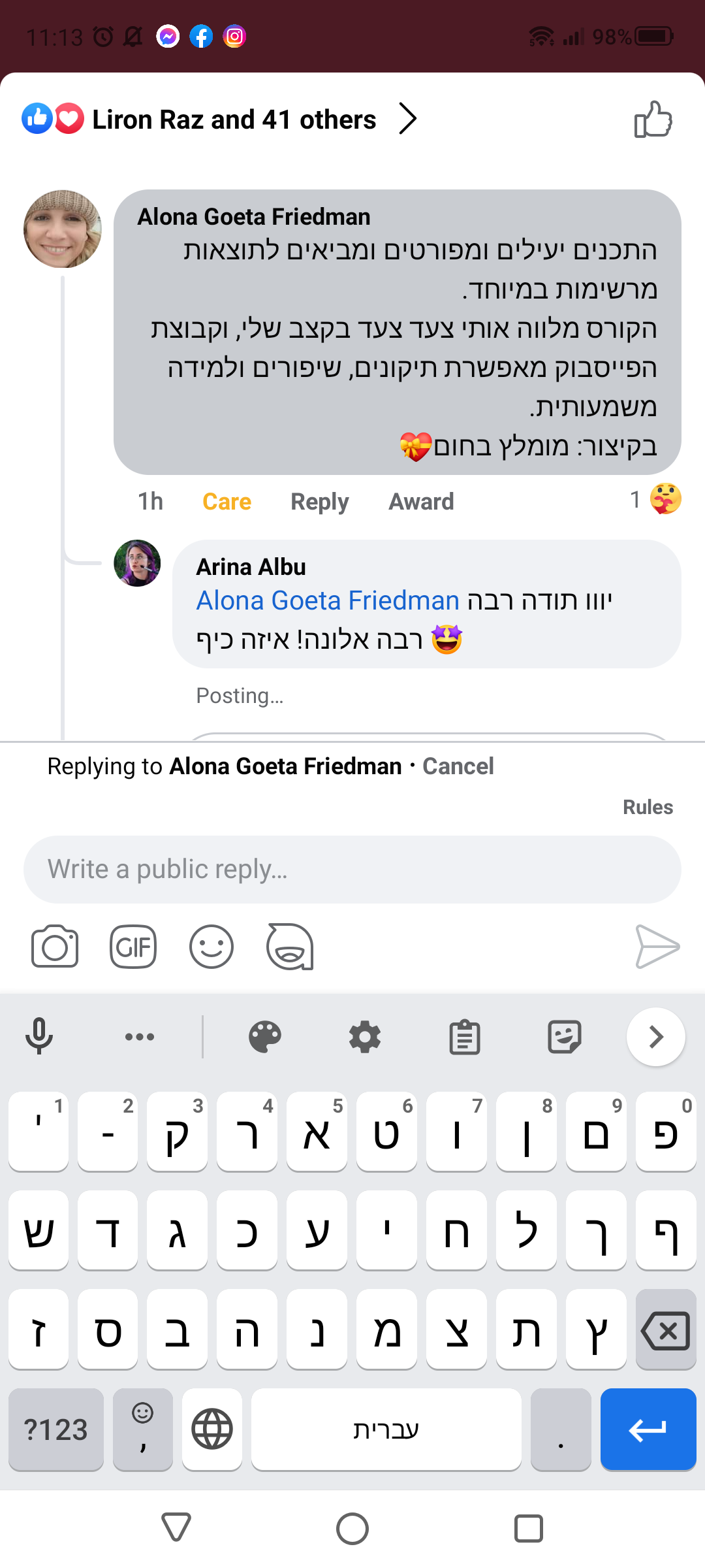 בנוסף ברגע ההצטרפות לקורס מקבלים גם אישור גישה לקבוצה הסודית שלנו בווצאפ, בה אפשר תמיד לשאול אותי כל שאלה, להתייעץ ולקבל ממני פידבק אישי. ככה אני מלווה את התלמידים לאורך התהליך עד שמגיעים לתוצאה שחולמים עליה, ואז מציבים חלום חדש...