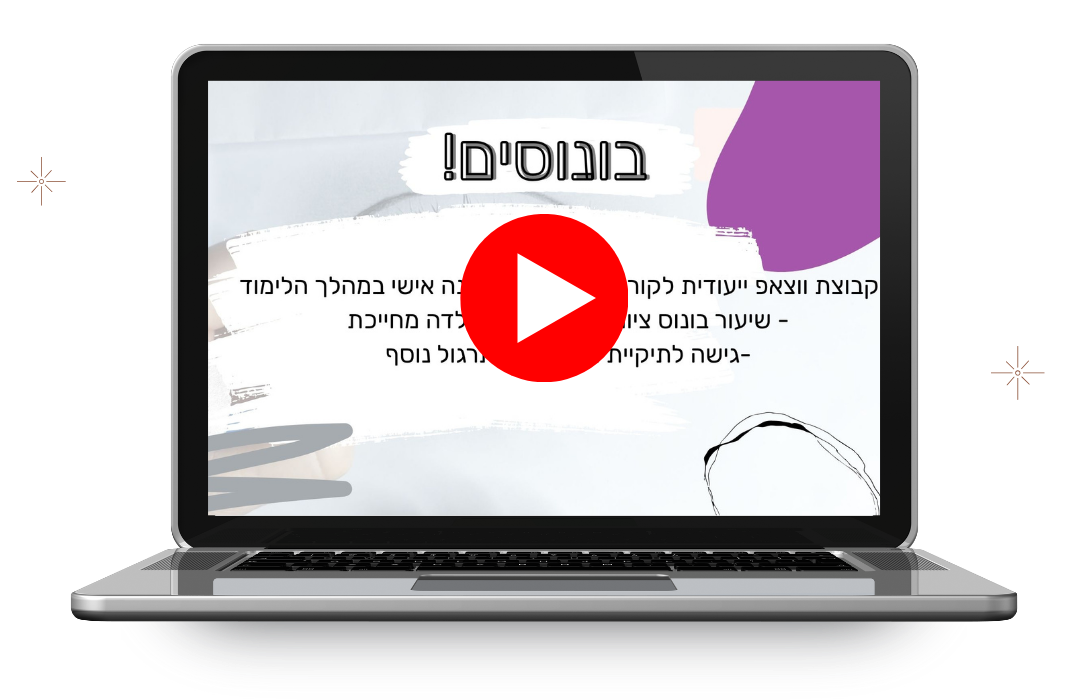 הקורס שלך לכל החיים, אפשר לצפות בו מתי שרוצים, מכל מקום בעולם, ולהתקדם בקצב שלך ללא כל הגבלה (גם לחומרים שנוספים לקורס עם הזמן ובונוסים מיוחדים) !
