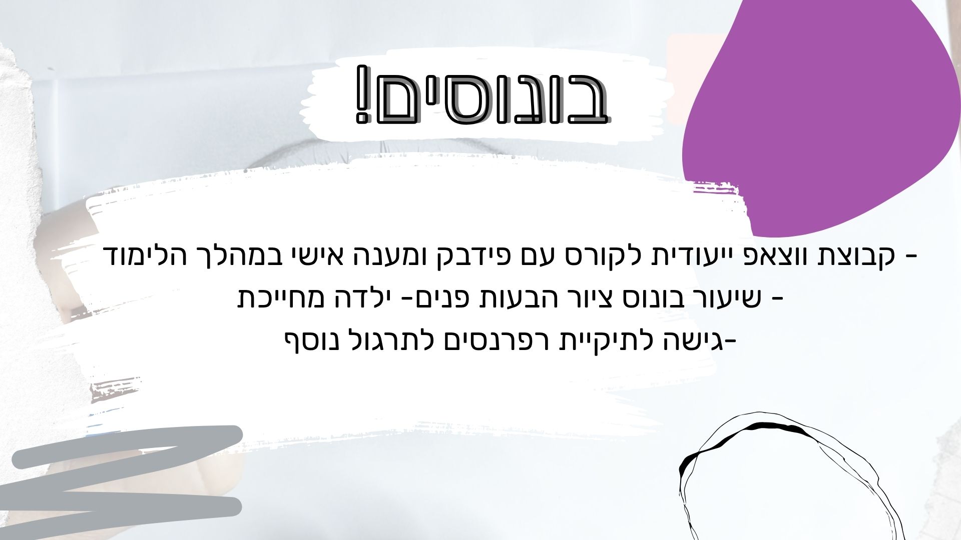 💬 קבוצת ווטסאפ סגורה עם ליווי, תמיכה ומשוב אישי במהלך הלמידה.