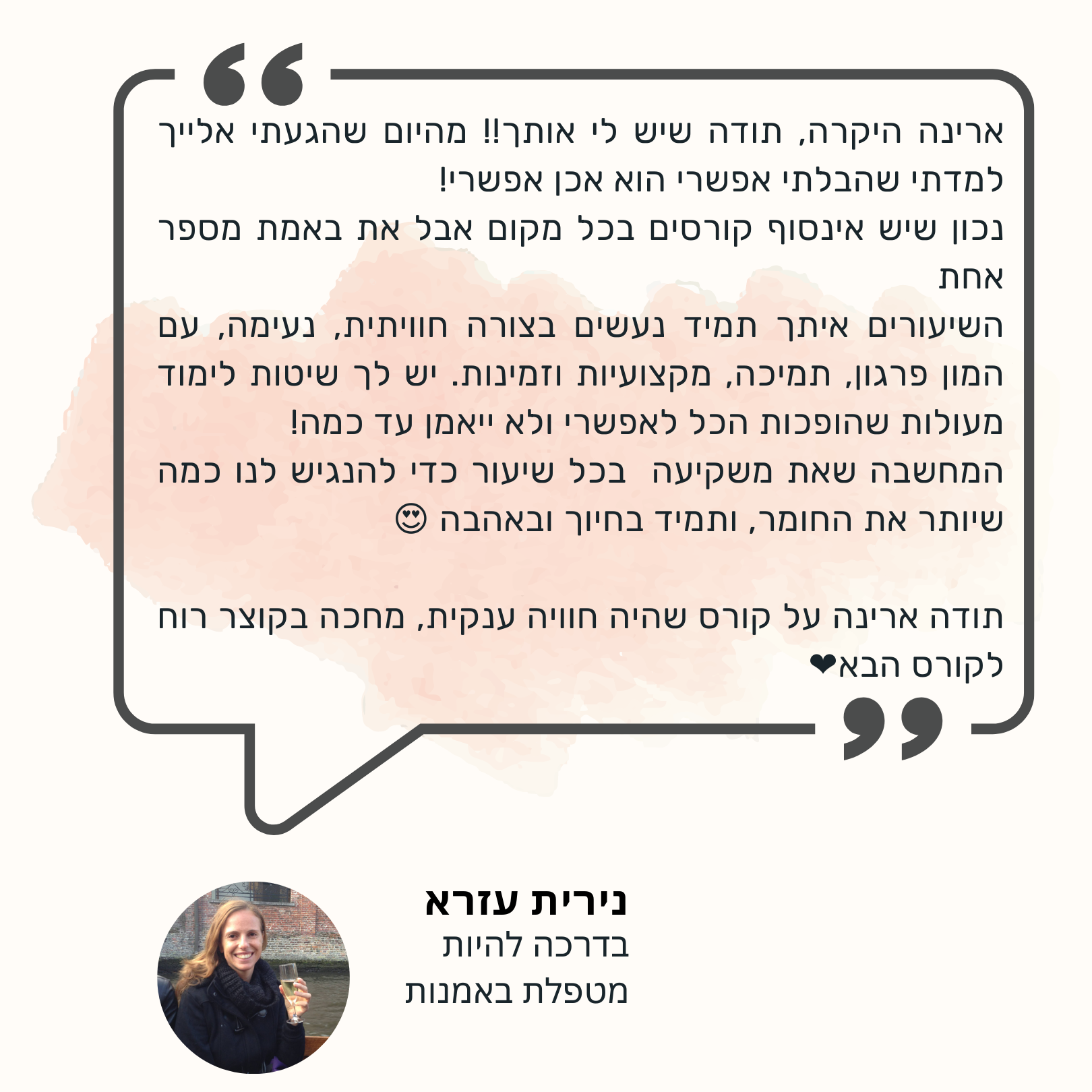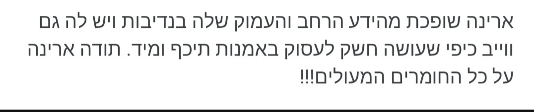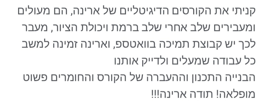 "בחיים לא נתקלתי בשירות כזה. ארינה עונה ועוזרת לכל אחד וממש מרגישים שאכפת לה שתצליח"