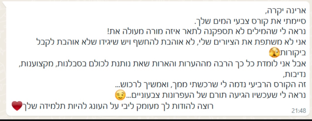 "מאז שאני אצל ארינה אני מציירת יותר, אני יודעת מה הסגנון שלי ואני פשוט מצליחה להירגע ולהנות עם הציור שלי כי יש לי שיטה שעובדת לי בציור"